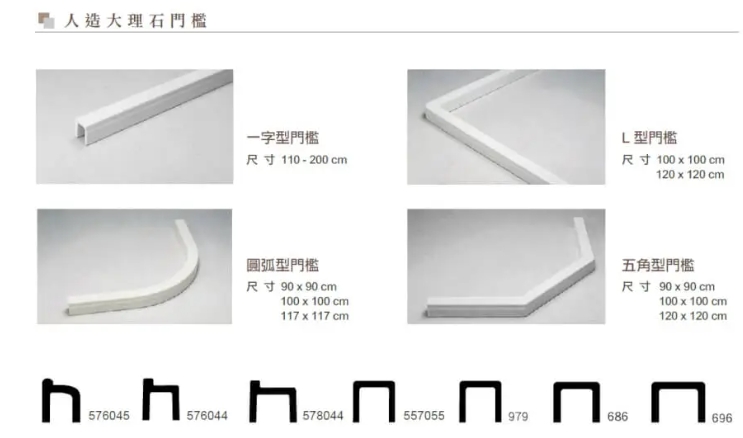 - 圓弧型:專門搭配圓弧型淋浴門,線條柔和優雅,能節省轉角佔用的動線。多搭配對應弧度的ㄇ型門檻,提供滑軌平整的支撐面。